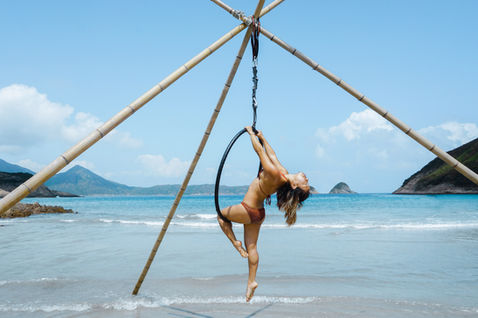 We offer a full or half day workshops in Hong Kong. A full day (suitable for beginners) starts with an aerial yoga class at Yoga Bam Bam in Central where we teach the basics of aerial including 5-7 inversion poses. It is followed by a hike to Tai Long Wan, the most beautiful beach in Hong Kong to fly on the bamboo tripods over the ocean. If you are familiar with aerial yoga and feel comfortable with going into inversions with some assistance, join our half day work shop on the beach.